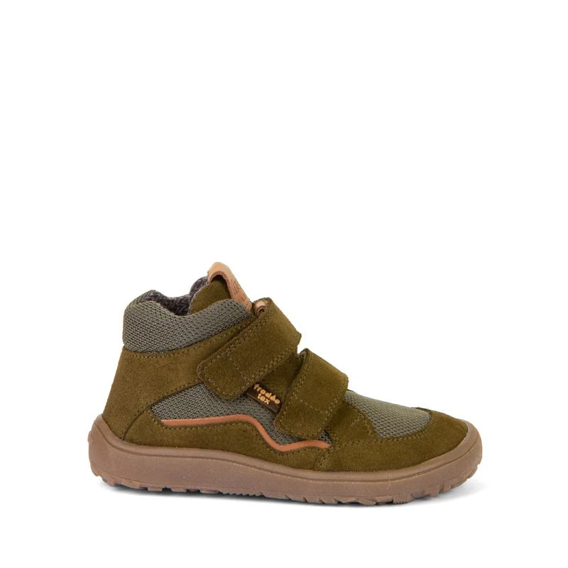 A waterproof high top boot from the Froddo barefoot range. This boot has a waterpoof membrane to add to the water resistant leather and synthetic mesh upper. It has a cosy textile lining with a removeable antibacterial insole. It is on the Froddo ‘Extra Grip’ barefoot sole unit. This sole is designed for more grip than the standard barefoot sole but is the same shape and width. The sole is 5mm thick with a 1mm lug. It is zero-drop, thin and flexible with the nice wide toe box we have come to expect from the Froddo Barefoot range. Please note however the boot does not have a fully gusseted tongue so water can ingress over the top of the boot. It is NOT designed as a welly substitute but as an everyday boot. It is not suitable for paddling or wading.