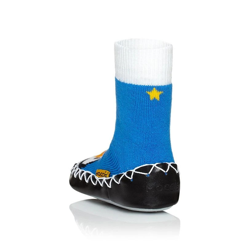 A high quality moccasin made in Sweden from natural ecotex certified materials in a fun blue penguin design.