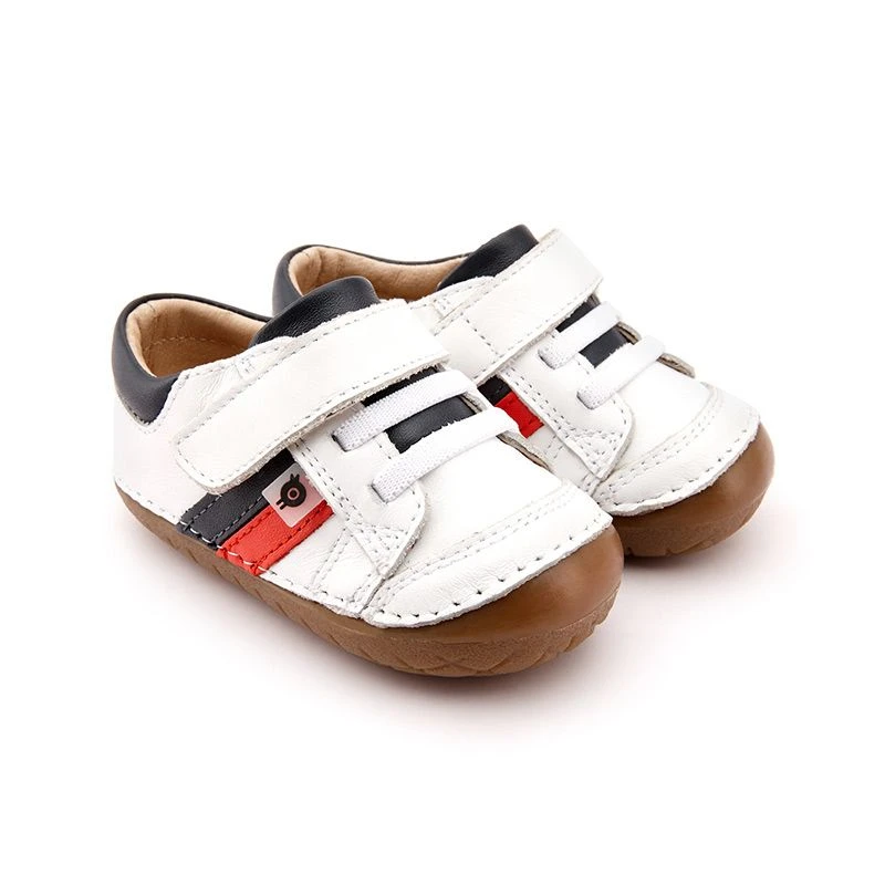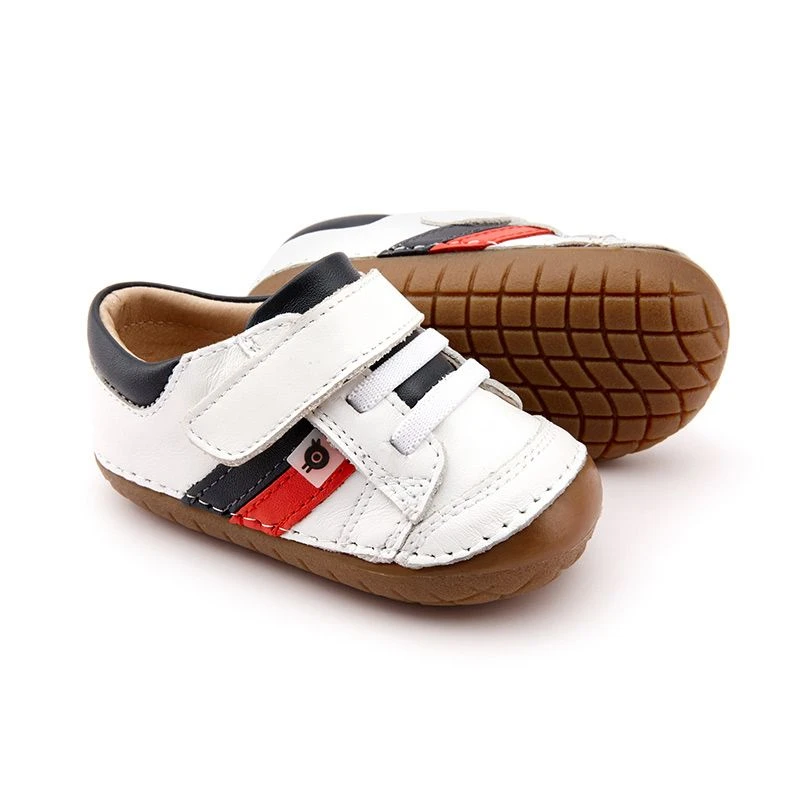 | Product Features | Premium leather shoe. 100% Leather upper. Leather lining and insole. 8mm thick sole measured with fixed insole. Zero drop and super soft and flexible rubber sole. Faux elastic and velcro fastener. |