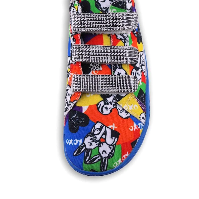 Fun and quirky shoes from Australian brand, PaperKrane. These shoes have a zero drop 4mm thin sole made of flexible natural rubber. The G&M Love Shoe has a printed fabric and leather upper with a matching coloured sole. They have a triple velcro fastener for a snug and comfortable fit with a durable stitched sole to increase lifetime. These amazing rainbow shoes are a PaperKrane collaboration with world renowned Australian artists, Gillie and Marc. They feature Gillie and Marc’s signature characters, Dog boy and Rabbit girl.