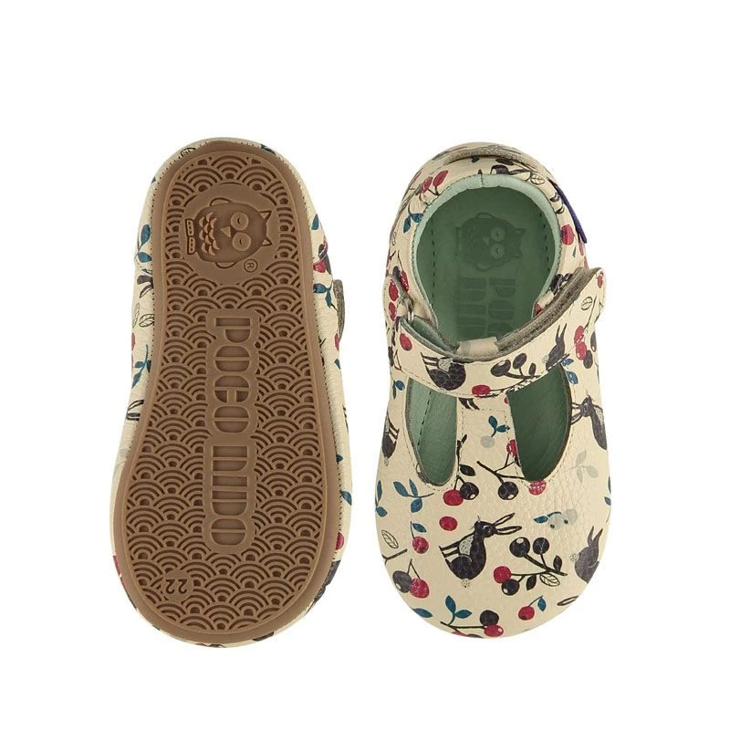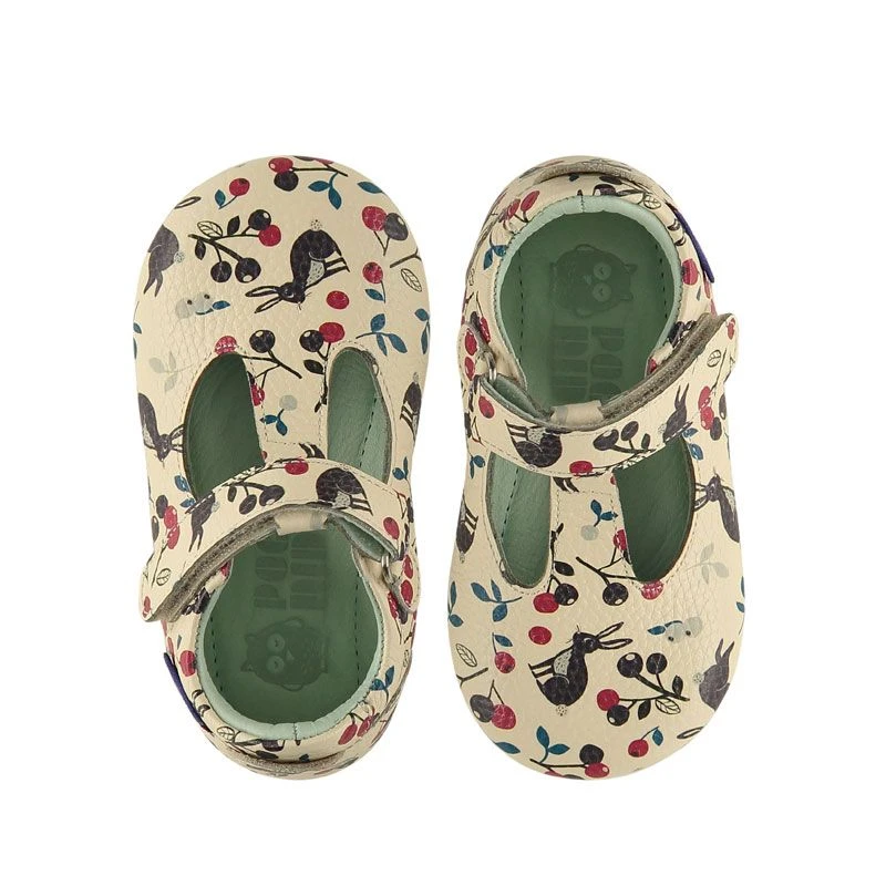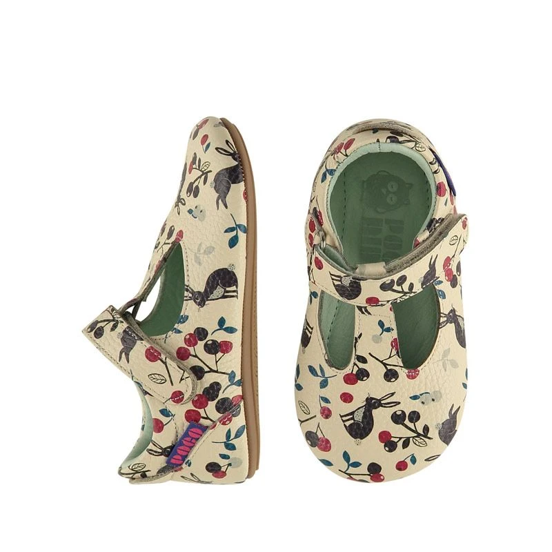 The Mighty Shoes from Poco Nido are a lovely range of rubber soled leather shoes. They are designed with barefoot principles to be beautifully foot shaped, with a thin and flexible TPU rubber sole suitable for outdoor adventures. They are made from a super soft leather in a range of beautiful colours and prints. This T-Bar version has a velcro closure and works well for higher insteps with a great adjustment to fit a range of widths.