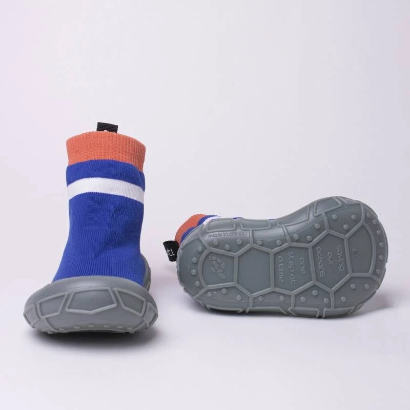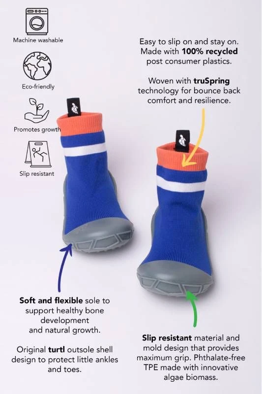 Turtl socks in a shell are an innovative indoor/outdoor sock shoe. They are eco-friendly and lightweight with a slip-on sock upper that is made from 100% recycled post consumer plastics. The stretchy knit is lovely and soft and has a ribbed cuff around the ankle to ensure a comfortable but secure fit. The slip-resistant protective shell sole unit is zero drop, 4mm thick and a great wide fit allowing for lots of space in the toe box. It is also recyclable and made from eco-friendly Bloom algae rather than plastic.